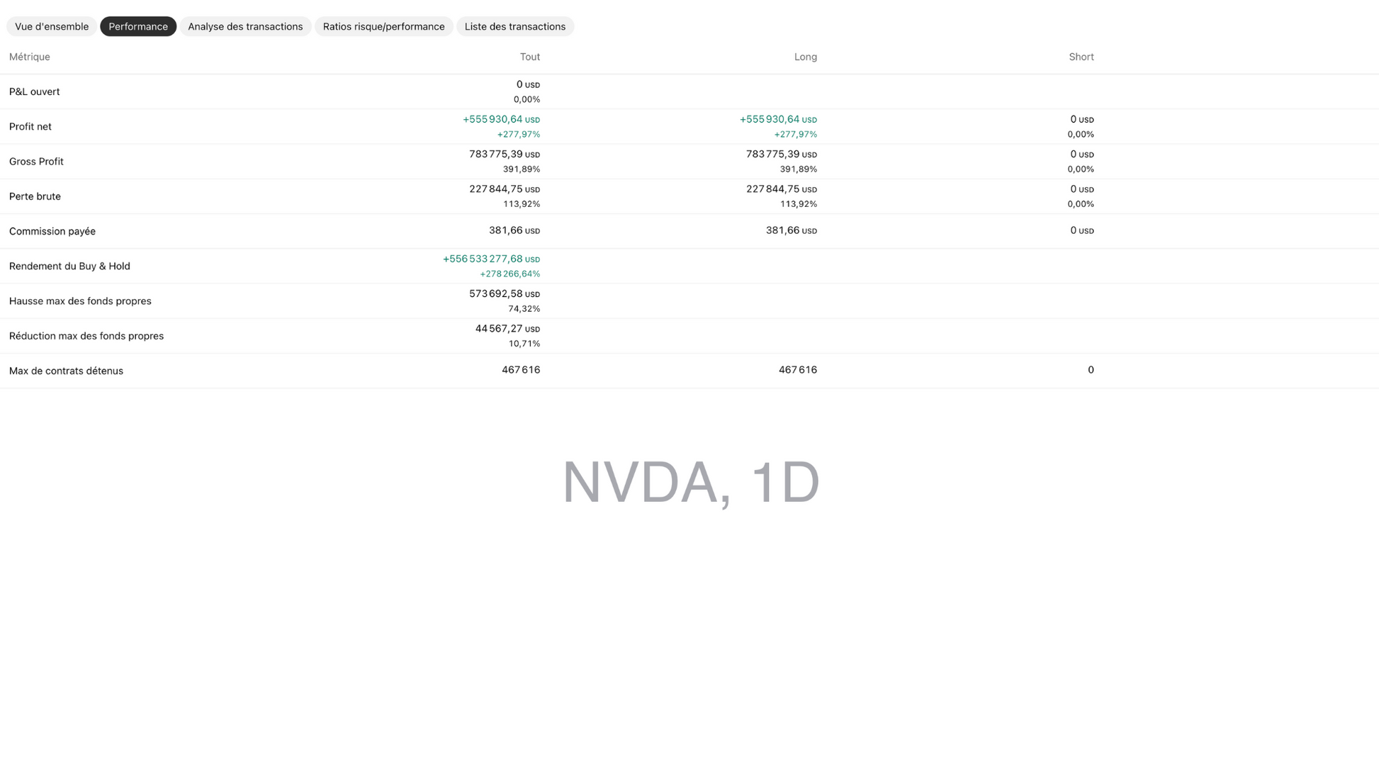 NVIDIA, l’une des actions les plus en vue du marché. Peu de trades, mais chacun d’une puissance impressionnante. Attendez-vous à ce que votre conseiller bancaire vous contacte pour comprendre comment vous atteignez un taux de réussite aussi impressionnant. Une de ses forces supplémentaire est qu'il est multi-time frame.
